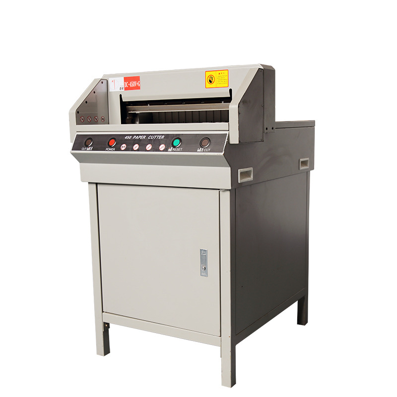 electric paper cutter DC-8450VG paper cutting machine paper guillotine Cutting width: 450*450 mm Cutting thickness: 40 mm Cutting accuracy: ±0.5 mm Paper press system: manual rotary handle Paper pushing approach: manually Power supply: AC 220V 550W Driving approach: Worm wheel transmission